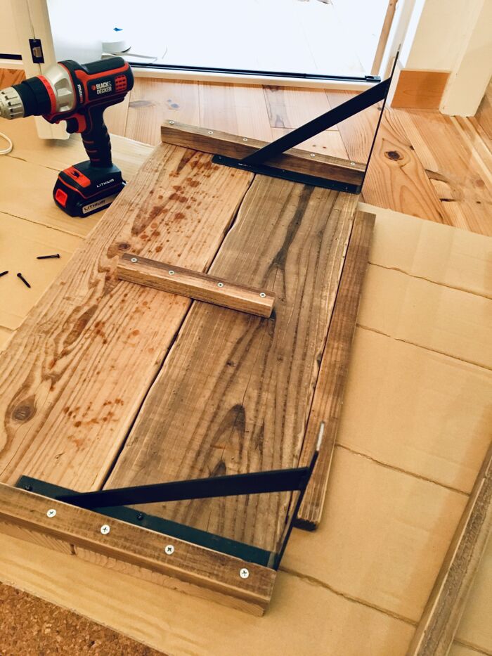 ↑作業風景。リビングに段ボールを敷いてビスを打っています。
