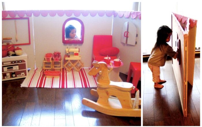 ↑MaMan*さんのお父様が孫たちのために制作してくれた折りたたみ式パネルや木馬。