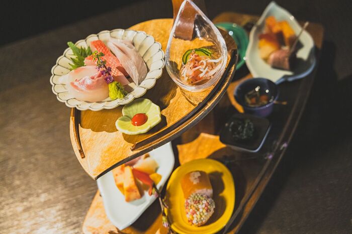 八寸とお造り、酢の物を合わせた宝楽盛りは、アフタヌーンティーをイメージした盛りつけです。