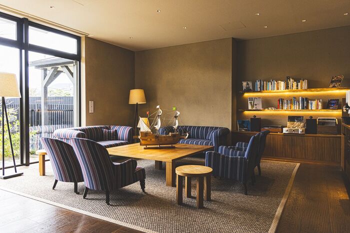 客室ごとにデザインは異なりますが、舵や櫂など船の古材をアートに見立てて各所にとり入れられているのが大きな特徴です。