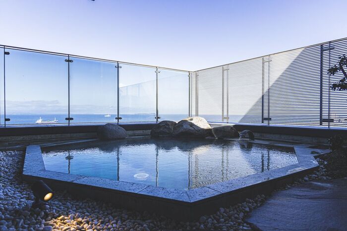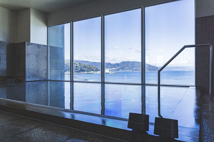 界 アンジンは、温泉もオーシャンビュー。内風呂はまるで海と一体化しているかのようなつくりで癒されます。アルカリ性単純温泉で、柔らかい肌触り。どんな年代でも肌質でも浸かりやすい、優しい泉質です。