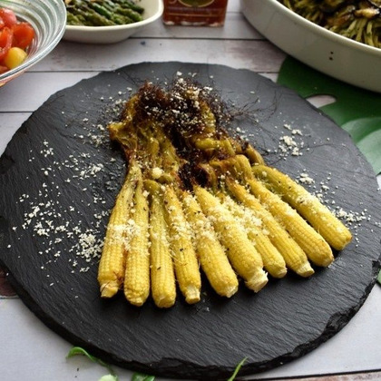 スーパーで生のヤングコーンを見かけても食べ方がわからなくて手を出せずにいる人へ。バター、チーズ、アンチョビと西洋の美食がてんこ盛りの「ひげ」までおいしく食べられる*yuko*さんのレシピを試してみては?盛りつけもお洒落。銀賞です。