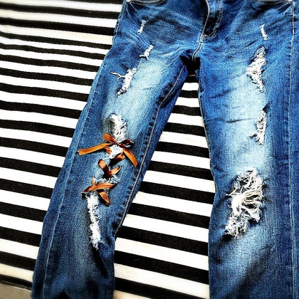 穴の開いたデニムを復活させる大胆なアイデア。編み上げ風のデザインが可愛いですね!裁縫道具やミシンが不要なのもらくちん♪リボンによって表情が変わりそうなのでいろいろ試しても楽しそうですよね。銀賞に決定です!