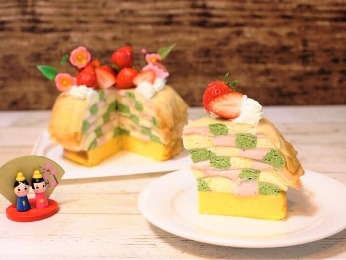 ●切った瞬間に現れる、ピンク・白・緑の市松模様が最高にかわいい!ひなまつりカラーで統一されていて、思わず「わっ!」って声が出ちゃうインパクト。SNSでもバズりそうな完成度です!(編集I)