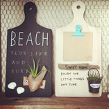 拾ってきた流木にサーフボード型のオブジェを突き刺してディスプレイ。木製トレイに砂や貝を敷き詰めて演出します。流木や貝を白っぽいもので統一すると清潔感がありますね。