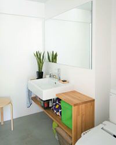 水回りは、浴室と洗面室の位置を交換。さらに2 in 1にすることで広々と。床はモルタル、壁は耐水性のある樹脂塗料でペイント。洗面台は「リボス」のオイルで仕上げました。