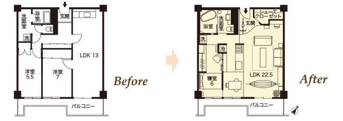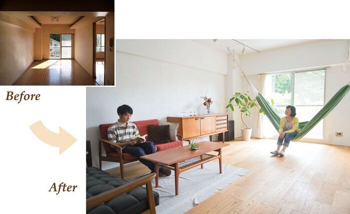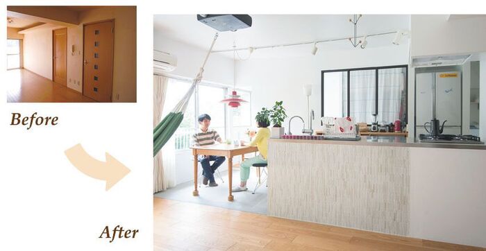 以前の内装はビニールクロスに合板フローリング。2部屋分の空間をゆったりとしたLDKにして、光と風をたっぷりとり込めるように。