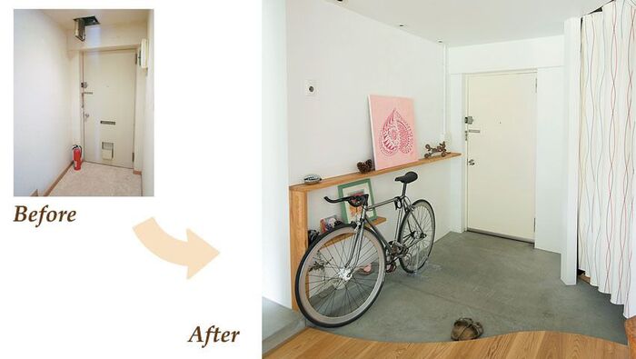 時代を感じさせる、こじんまりとした集合住宅の玄関。靴箱もありませんでした。