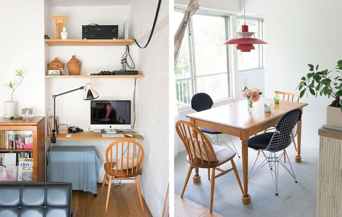 LDの一角のワークコーナー。玄関横に設けたシューズクローゼットにへこみをつくり、スペースを確保しました。「こういうフレキシブルさと自由さがリノベーションならでは!」(左)
