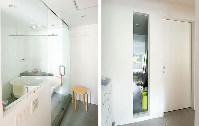 浴室と洗面室に、外光をとり込めるように設けたスリット窓。廊下側からは絶妙に視界が遮られています。「冬場は朝日がさし込んで、本当に気持ちがいいんです。湯船につかりながら外の景色に癒されています」。洗面室との仕切りもガラスにすることで、明るく開放的に。