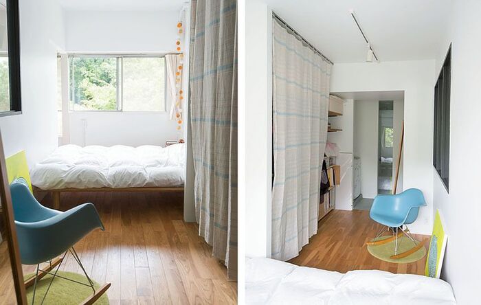 寝室の一角には、天井までの高さを生かした、たっぷりしまえる収納を。使い勝手を考慮して、扉をつけず布で目隠し。(右)