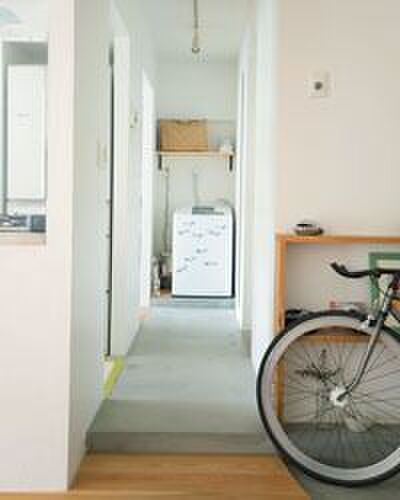 キッチンや洗面室に続く廊下の床もモルタル仕上げに。キッチンの位置を変えたので、配管の都合で床のレベルを上げました。正面の洗濯機置き場の棚は入居後にDIYで設置。