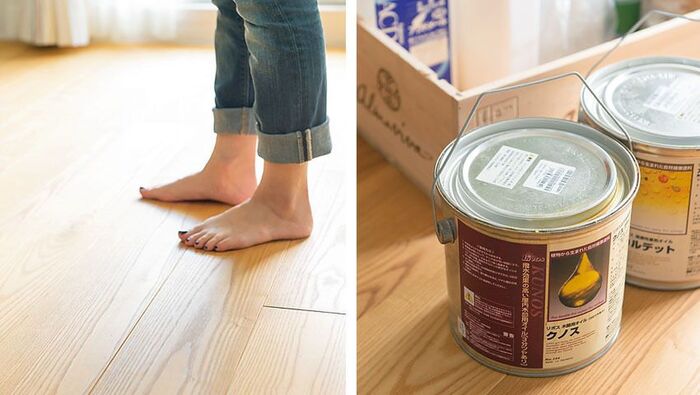 水回りの木部は撥水効果のある「クノス」、LDKの床はマットな質感の「カルデット」のオイル仕上げに。「自分たちで塗ったので、今後、メンテナンスも気軽にできます」