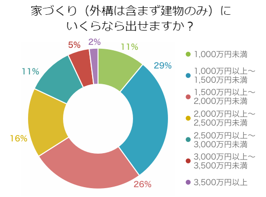 次に、これから家づくりをする人へのアンケート結果。「建物本体にいくらなら出せますか? 」という質問には、やはり半数以上が2000万円未満と答えています。注目したいのは、実際に建てた人と比べて、1500万円未満がやや多いこと。目標はあくまでローコストに、1500万円未満を目指す人が多いようですね。