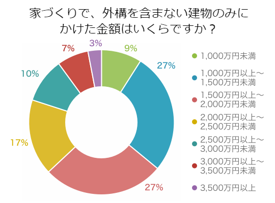 ずばり、建物本体にかけた金額は、50% 以上が2000万円未満。しかもその半数は1500万円未満でした。「ローコスト住宅は人気がある」というイメージだけでなく、30~40代では実際にローコスト住宅を建てている人が多いということがわかりました。