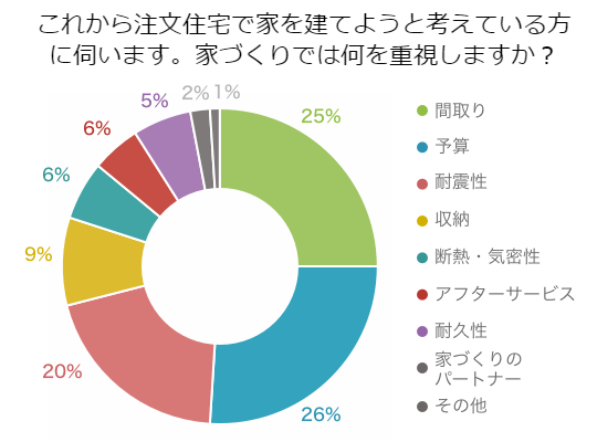 同じ回答者に「家づくりで重視したこと」も聞いてみたところ、1 位は僅差で「間取り」でしたが、2 位はほぼ同じくらいの割合で「予算」。やはり予算をベースに計画を立てた人が、実際にローコストな家づくりに成功していることがうかがえます。