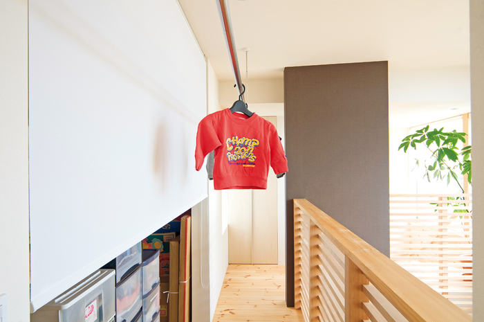 人が入れる納戸をつくるだけの面積がない場合は、廊下などに面したオープンな納戸もおすすめ。このお宅では3階の廊下に沿って、2.8畳もの広さの納戸をつくりました。ロールスクリーンで目隠しをすれば視界もスッキリ。(Fさん宅)