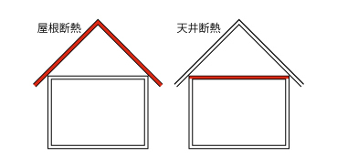 屋根断熱と天井断熱といい、図のように、屋根で断熱するか、天井で断熱するかの違いです。