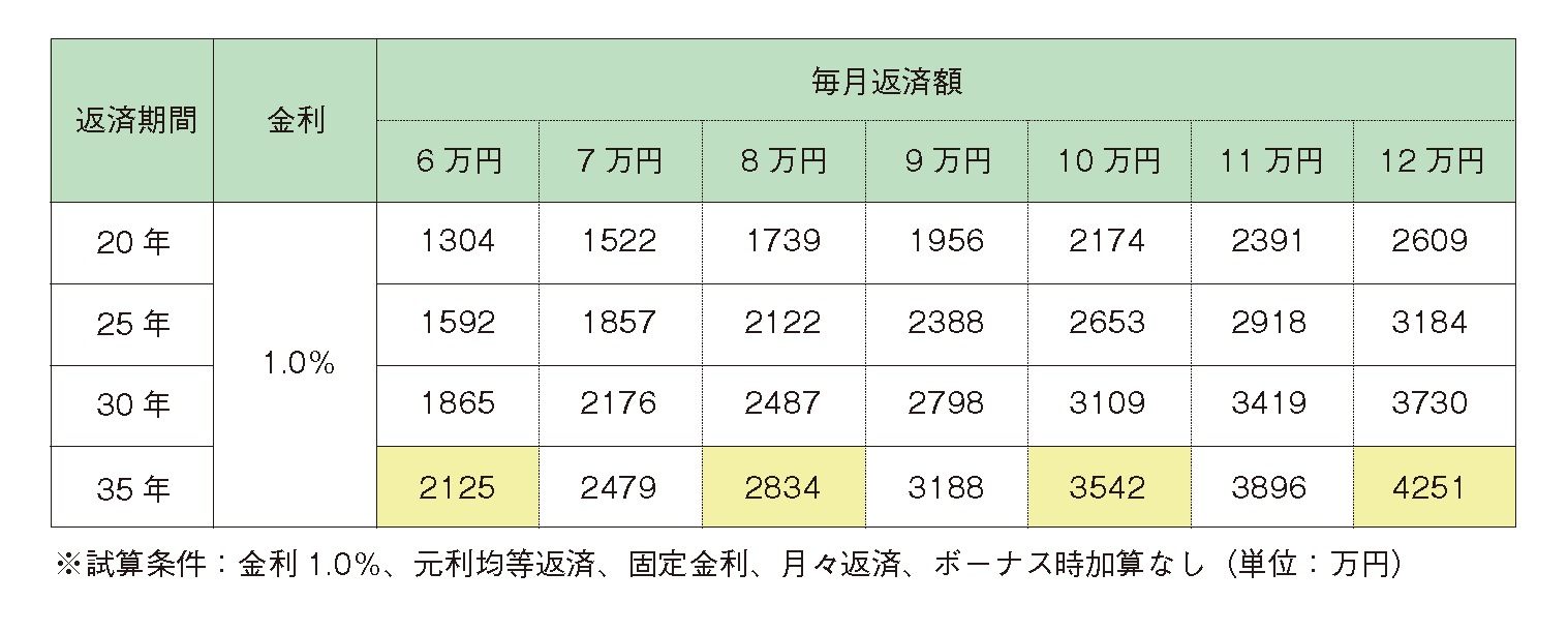 この返済額を参考に借入金額を計算したのが以下の表です。