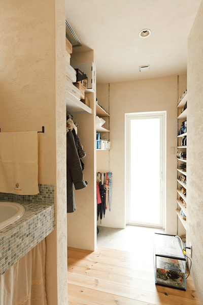●ウォークスルーできるシューズクロークでは、収納の内側で靴が脱げるので、メインの玄関に靴が散乱せず、お客さまを気持ちよく招くことができる