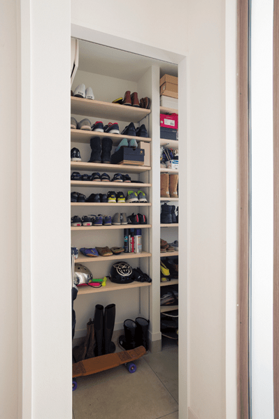 シューズクロークは一時期、「靴を美しく収納できて、マジックのように玄関がすっきりする」と話題になりました。たしかに、きれいなヒールの靴やかわいい子ども靴がコレクションされている様子は素敵ですよね。でも、現実は「泥や雨や汗で汚れたスニーカーやブーツがぎっしり! 」になるのが一般的。その様子を思い浮かべてプランしないと、計算違いになってしまうかもしれません。
