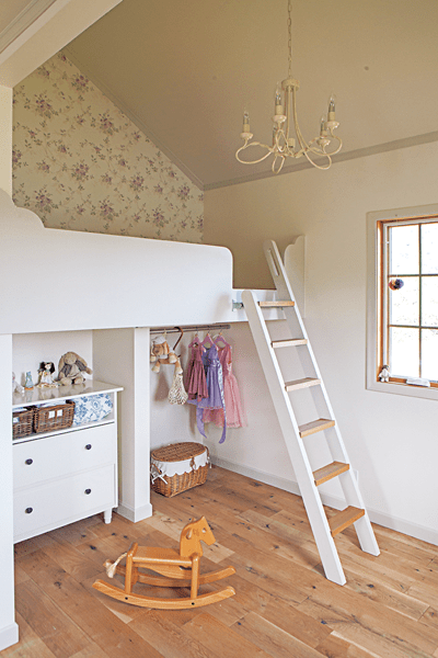 大工さんが現場施工したロフトベッドは、下を収納に活用できて合理的。お子さんの好きなクロスを選びました。床は無垢のナラ材。