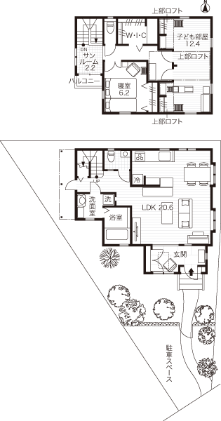 延べ床面積:113.34㎡(34.29坪)1F60.88㎡+2F52.46㎡(ロフト8.94㎡は除く)