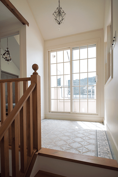 バルコニーから光がたっぷり入るタイル貼りのサンルーム