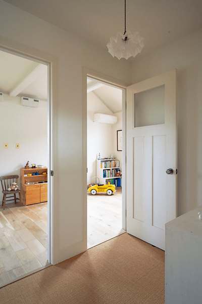 勾配天井に見せた梁が楽しい子ども部屋。ドアを2つ設けて、将来は間仕切りもできるプランに。チェッカーガラス入りのドアがかわいい。
