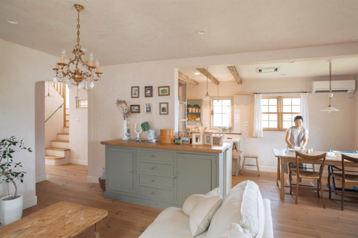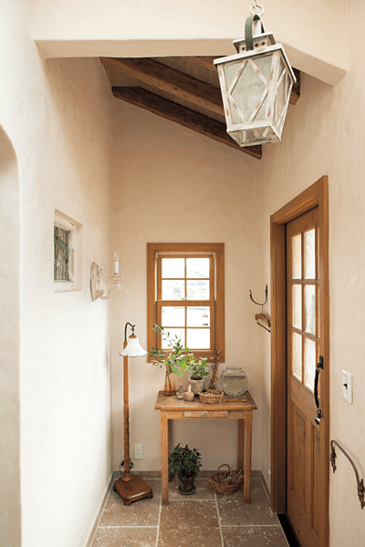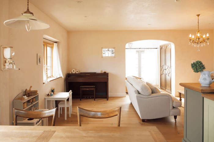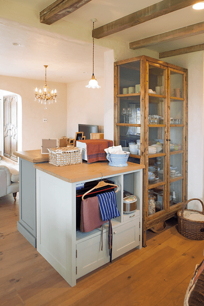 コテでていねいに塗ったしっくいや無垢材の床など、新築当時からアンティークになじみ、時を経て美しさを深める家。帰宅したご主人が「落ち着くなあ」とほほえみ、子どもたちはお出かけしても「早く帰ろうよ」というこの家は、「理想の家。ていねいに暮らし、大事に住み続けたいです」としみじみ語る奥さまです。