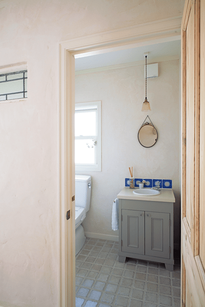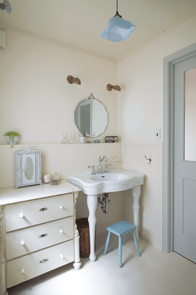 手洗いカウンターはまるで家具をポンと置いたような脚つきのデザインに。壁に貼ったブルーのタイルはアンティークです。
