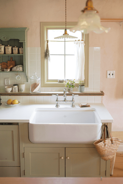 以前から憧れていたというエプロンシンク。窓に向かうスタイルが似合います。水栓もレトロな2レバーに。