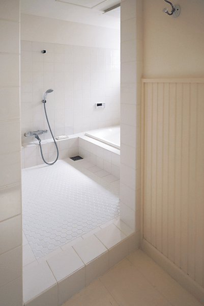 在来工法にこだわった浴室。床には滑りにくく、見た目もおしゃれな六角形のタイルを貼りました。