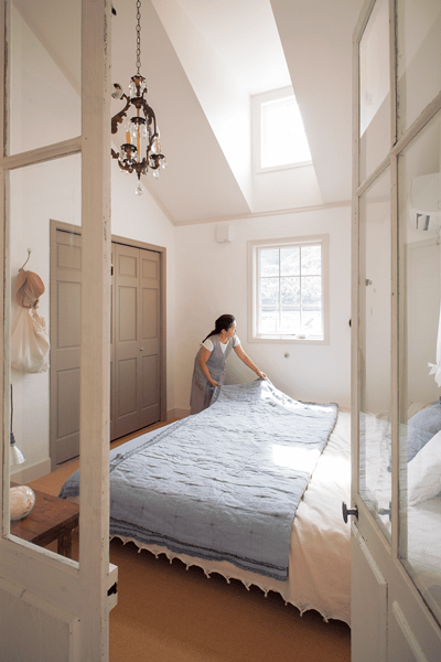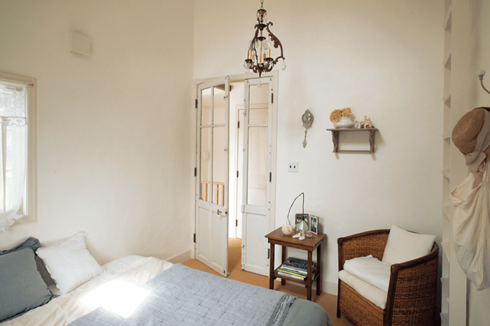建具や照明、パーツなどは塩谷さんがネットで探したり、イメージを「サラズ」の伊賀さんに伝えて探してもらったり。特にお気に入りは寝室に使ったフランスアンティークのドア。「デザインもペイントの雰囲気もノブも、とにかく素敵で。ドアに合わせて寝室の壁は真っ白にしてもらったんです」