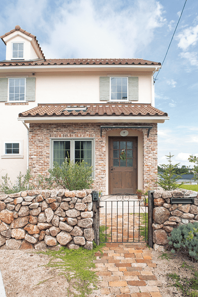 ランダムな石の味を生かした石積みの塀、レンガの壁、アプローチに敷いたアンティークレンガ。フランスのバラの村、ジェルブロワをイメージした外まわりです。