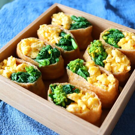 菜の花と卵を使った春のお弁当にピッタリな、いなり寿司です。
