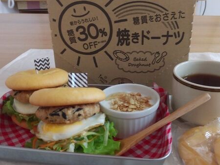 いつも作っている鶏ハンバーグを糖質オフドーナツで挟んで、ドーナツバーガーにしたものです。