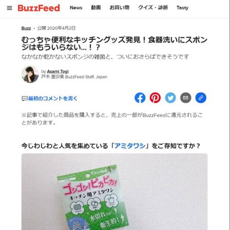 話題のトピック・コンテンツが盛りだくさん『BuzzFeedJapan』で、【むっちゃ便利なキッチングッズ発見!食器洗いにスポンジはもういらない...!?】という記事で「キッチン用アミタワシ」をご紹介頂きました。