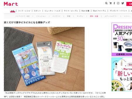 Mart(マート)2021年3月号(光文社:1月28日発行)内特集『「あの洗剤」はホイップするともっといいらしい』記事内で、紹介者の掃除研究家・掃除ライターのおそうじペコさんに、いっしょに使いたいアイテムとして「フローリング用おそうじクロス」をご紹介頂きました♪