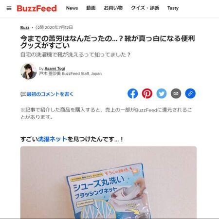話題のトピック・コンテンツが盛りだくさん『BuzzFeedJapan』で、【今までの苦労はなんだったの…?靴が真っ白になる便利グッズがすごい】という記事で「シューズ丸洗いブラッシングネット」をご紹介頂きました。