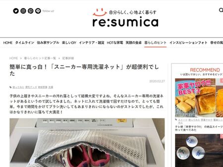 我が家をもっと楽しくて居心地のいい"家族のパワースポット"にするためのさまざまなアイデア、家具、インテリア雑貨、食卓、リノベーションなどの情報や実例を紹介するWEBメディア『re:simica』で、暮らしのヒントとなる便利グッズ【簡単に真っ白!「スニーカー専用洗濯ネット」が超便利でした】という記事で「シューズ丸洗いブラッシングネット」をご紹介頂きました。