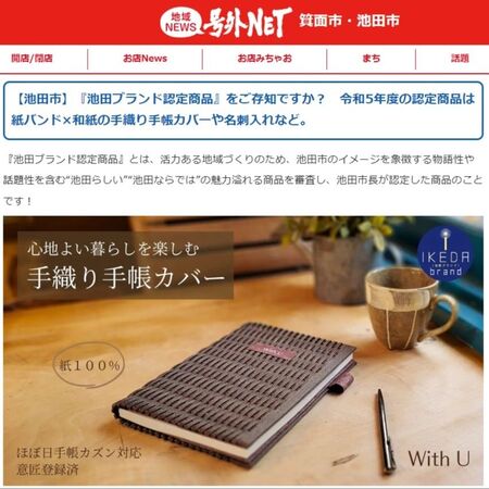 当店が立ち上げた紙バンド製品ブランド「With U」の池田ブランド認定品「手織り手帳カバー」「手織り名刺入れ」について取り上げていただいております。