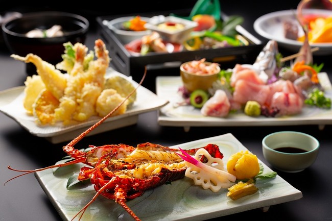 伊勢海老や金目鯛、明日葉など伊豆山海の恵みを会席料理でご堪能ください。ライブキッチンより届く、揚げたて天麩羅はお好きなだけどうぞ。ムーンロードや朝日に輝く海を眺めながら、夕食や朝食をご堪能いただけます。