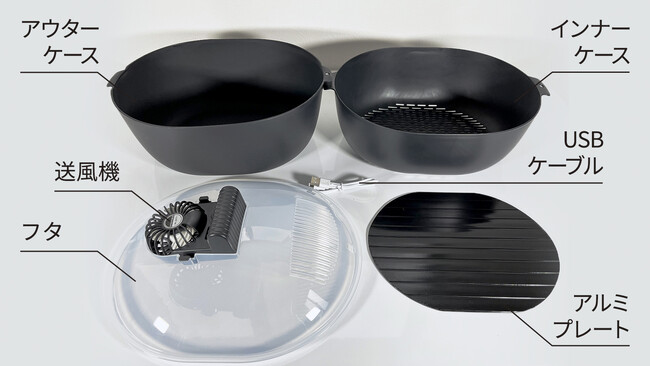 セット内容:アウターケース、インナーケース、送風機、フタ、アルミプレート、USBケーブル