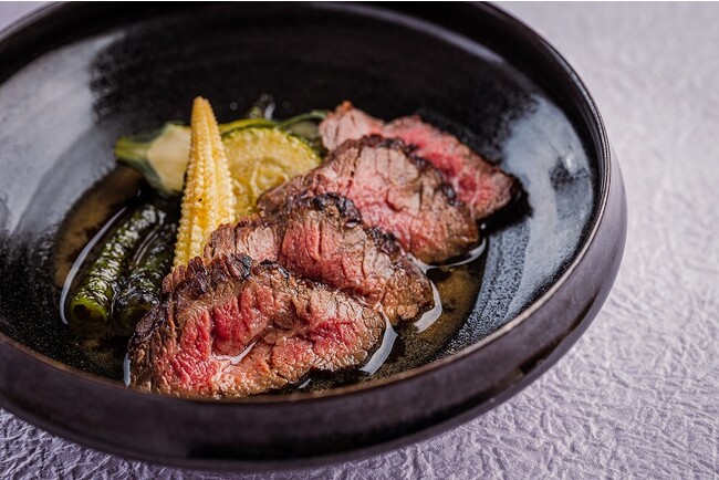 尾崎牛を直火でこんがりと焼き色を付け、「銀座豉特選 雅」の上澄みをだし汁に落とし仕上げました。夏野菜は揚げ浸しにして添えています。