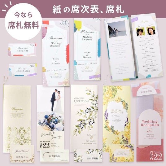 こちらは当日のマストアイテムである席次表&席札もセットになっているため、結婚式に必要なペーパーアイテム類をこのワンセットでもれなく準備することができるのも嬉しいポイント!しかも、今ならなんと《席札無料》。特別なプランになっています。