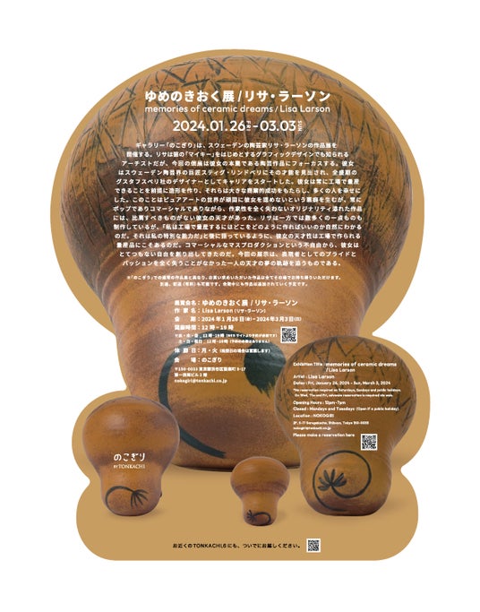 ギャラリー「のこぎり」(東京都渋谷区)は、陶芸家Lisa Larson(リサ・ラーソン)の作品展「ゆめのきおく展/リサ・ラーソン」を、2024年1月26日(金)から3月3日(日)の会期にて開催します。