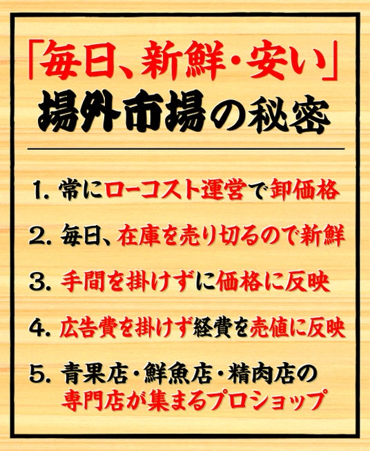 東京都江戸川区に位置する「西葛西 場外市場」は、地域の皆様に毎日新鮮でお求めやすい商品を提供することを目指しています。当市場は以下の5つの秘密に基づき、常に高品質の商品をお届け致します。