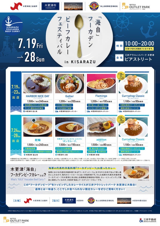 2024年7月19日(金)~7月28日(日)までの10日間、三井アウトレットパーク 木更津にて『「海自」フーカデンビーフカレーフェスティバル in KISARAZU』を開催致します。