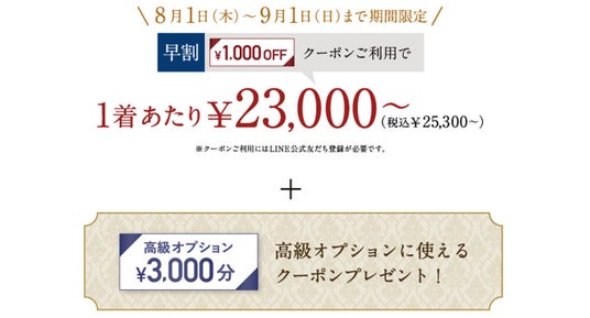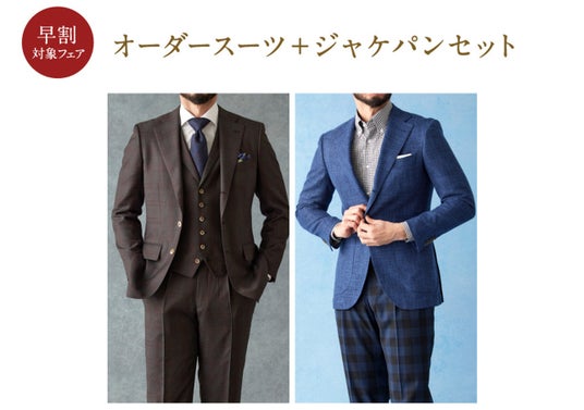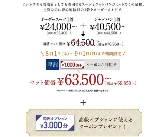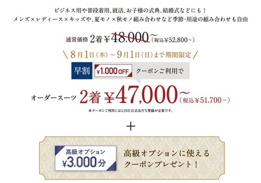 対象プランご利用で!本格オーダースーツ2着47,000円~(税込51,700円~)+高級オプション3,000円分付き